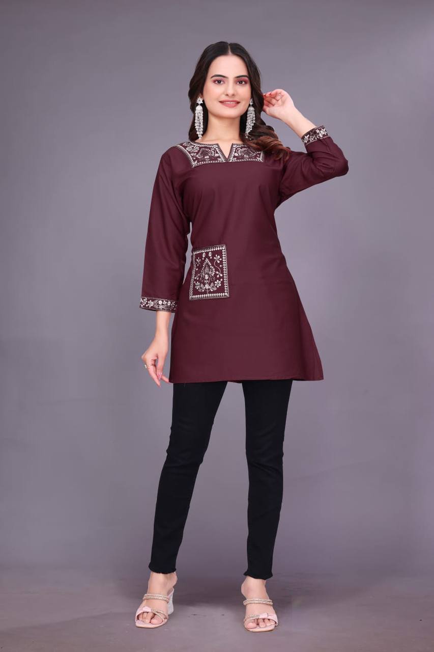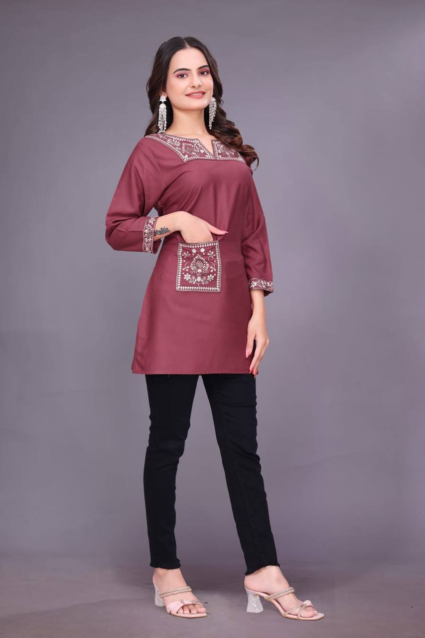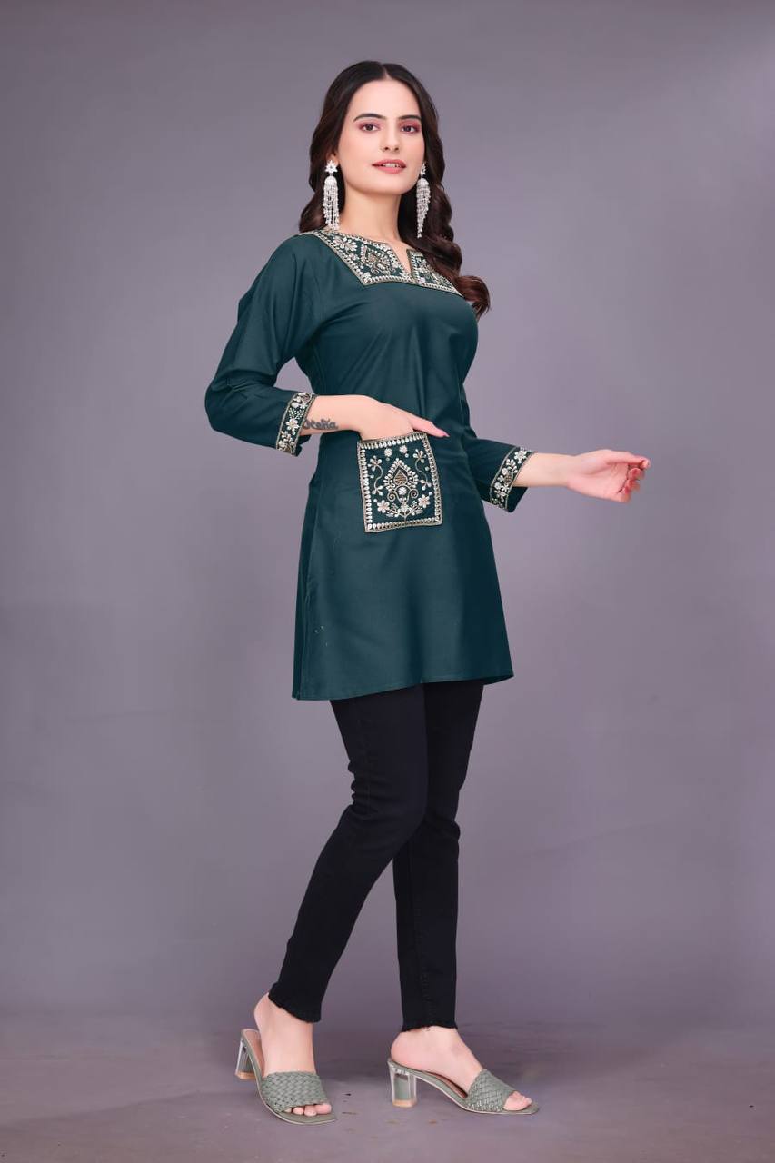 Upgrade your everyday ethnic style with the RO9345 Heavy Rayon Kurti, crafted with beautiful embroidery and a convenient side pocket. Designed in soft, breathable rayon with 3/4 sleeves and 30+ length, it offers both comfort and elegance. Available in sizes S to XXL.